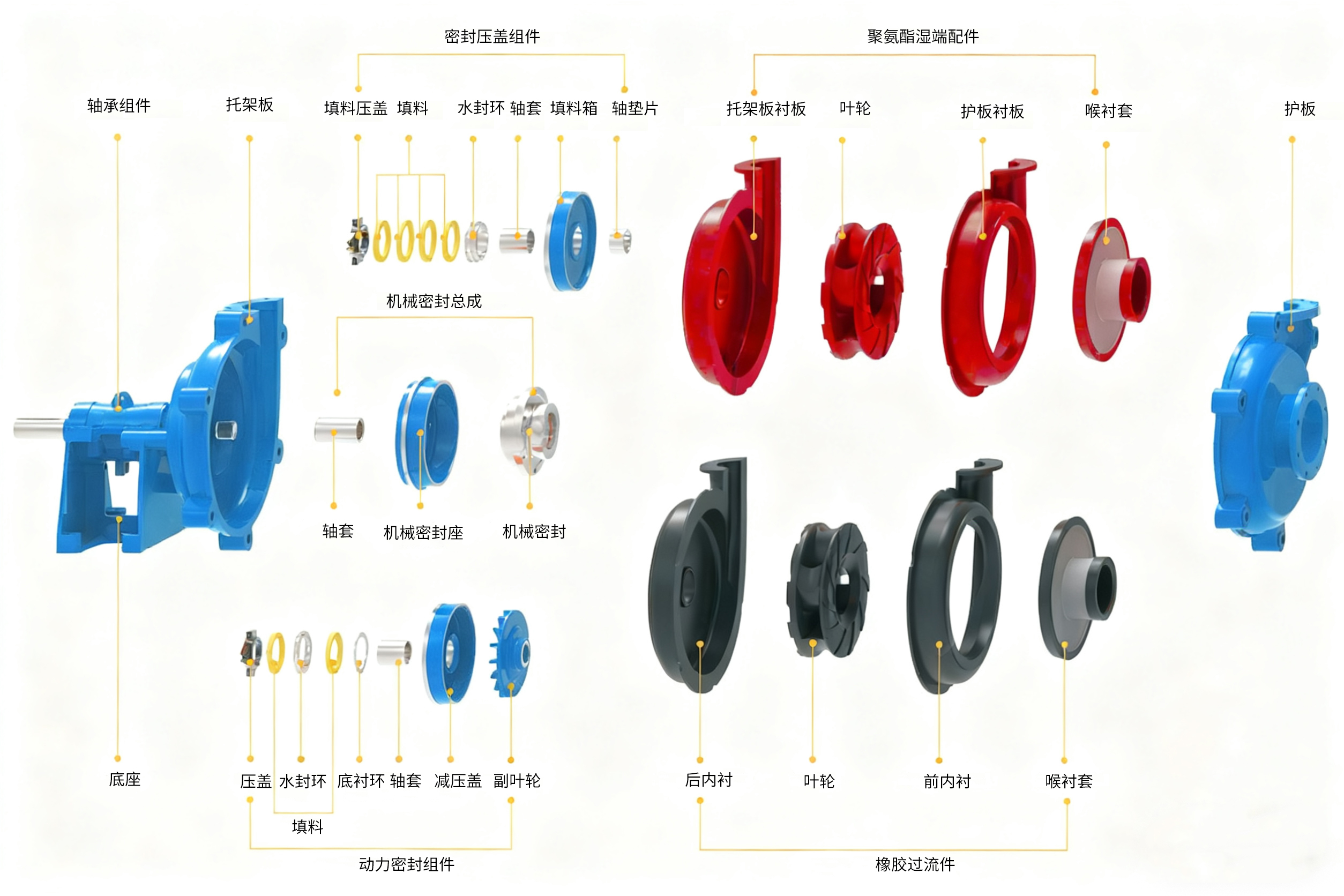 1. 防腐蚀湿部件:(叶轮、喉衬、机架衬板、盖板衬板)。这些湿部件均加厚以延长使用寿命。