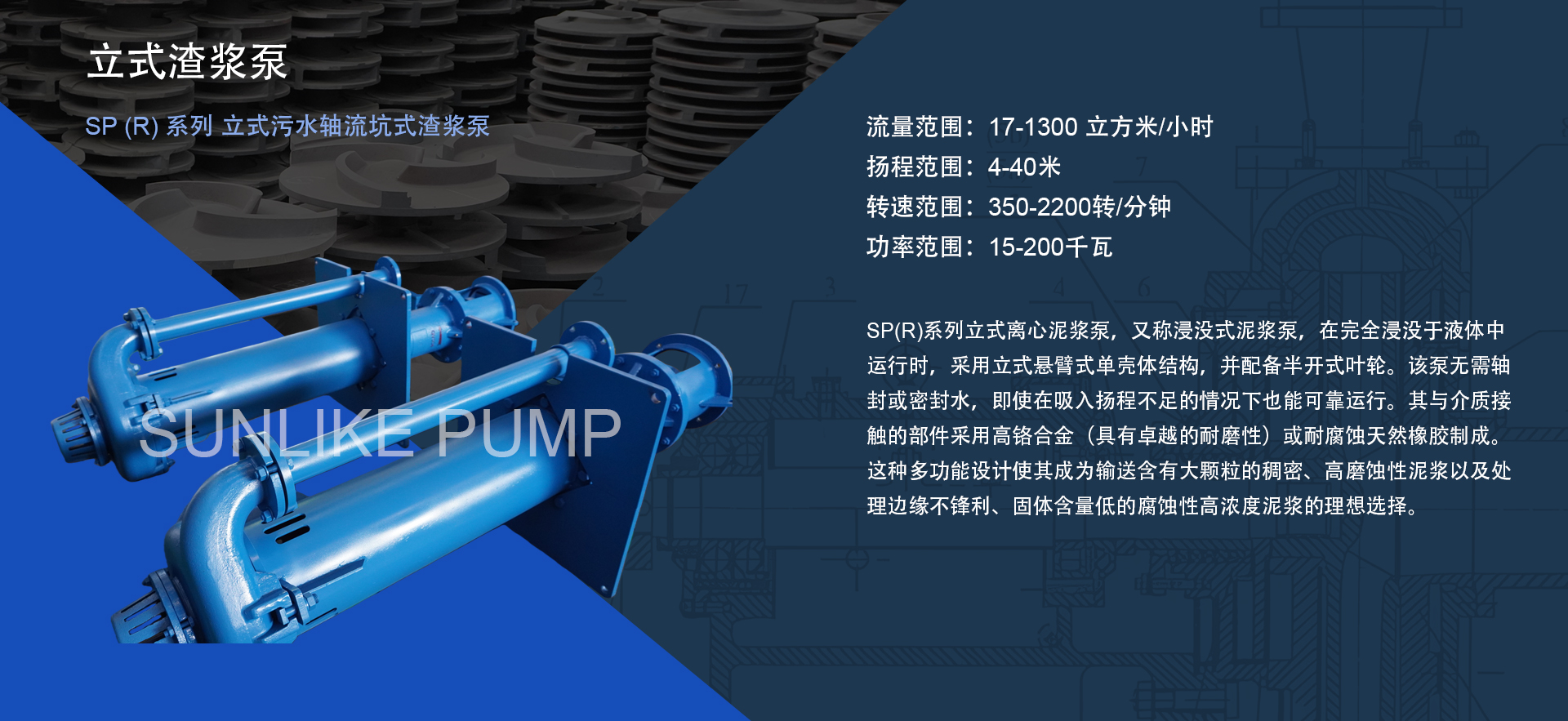 森力克SP/SPR 立式半浸式泥浆泵采用轴封保护设计,专为需要比传统立式工艺泵更高可靠性和耐用性的应用而设计。其重型悬臂式结构使 SP/SPR 半浸式泥浆泵非常适合在水池或坑中连续输送磨蚀性和腐蚀性液体和泥浆。